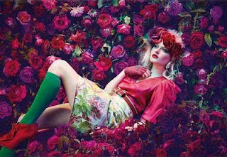 I'm still undecided on Alice band with 4-5 of my favourite vintage brooches pinned...or am I going to to do large flowers in my hair?? Taking it over my normal one flower and making it 'wedding' with 2 or 3 large? Not sure but I love this image with the floral background and the amazing floral headress